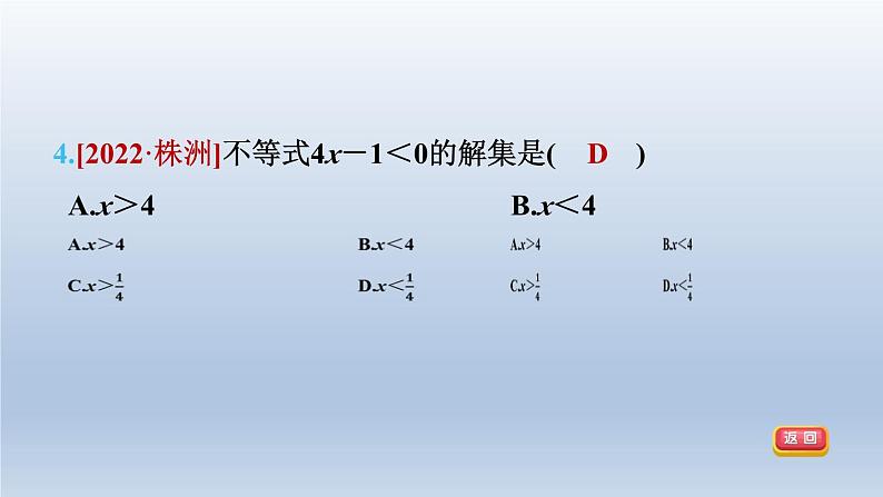 4.[2022·株洲]不等式4x-1<0的解集是( D )