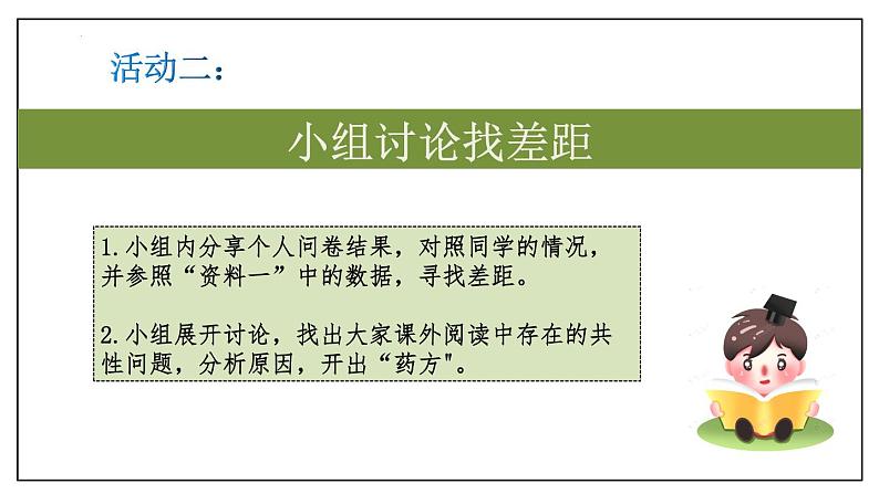 这是一份语文人教部编版综合性学习 少年正是读书时完美版教学ppt课件,共25页。PPT课件主要包含了学习目标,分析数据知自己,活动一,分析图表,填写问卷,小组讨论找差距,活动二,同学之间找差距,小组讨论找办法,共同研讨促阅读等内容,欢迎下载使用。