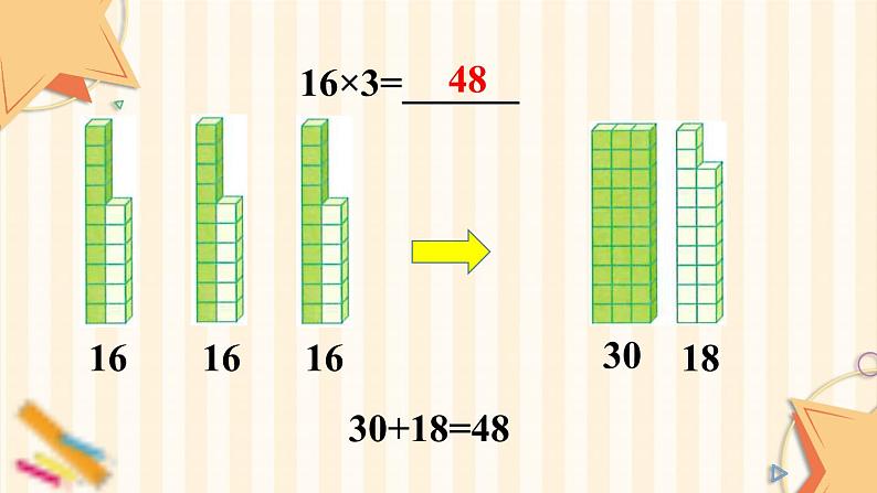 这是一份小学数学人教版三年级下册口算乘法第1课时教学设计及反思,共16页。PPT课件主要包含了导入新课,自主探究,筐有多少盒草莓,总盒数为,+16+16,列式16×3,用加法计算,分步口算,×330,×318等内容,欢迎下载使用。
