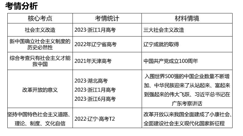 这是一份专题二社会主义在中国的发展课件 2023届高考政治二轮复习统编版必修一中国特色社会主义,共60页。PPT课件主要包含了〖析考情明方向〗,〖联时事做预测〗,考向1,新民主主义革命的胜利,考向2,〖做真题找规律〗,〖模拟练提能力〗,伟大的改革开放,考向3等内容,欢迎下载使用。