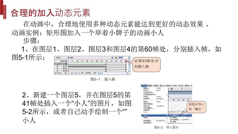 在动画中,合理地使用多种动态元素能达到更好的动态效果 。动画实例:矩形图加入一个举着小牌子的动画小人 步骤: 1、在图层1、图层2、图层3和图层4的第60帧处,分别插入帧,如图5-1所示: