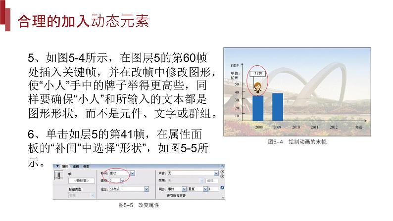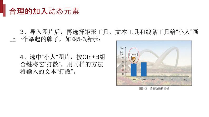 这是一份初中信息技术桂教版八年级上册第二单元 我国GDP的发展—动画制作初步第五课 调整动画多媒体教学ppt课件,共13页。PPT课件主要包含了合理的加入动态元素,调整动画等内容,欢迎下载使用。