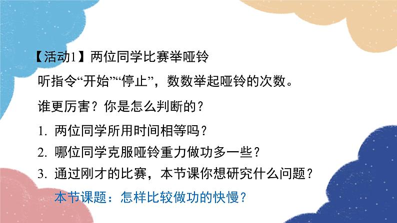 两位同学所用时间相等吗?哪位同学克服哑铃重力做功多一些?通过刚才的比赛,本节课你想研究什么问题?