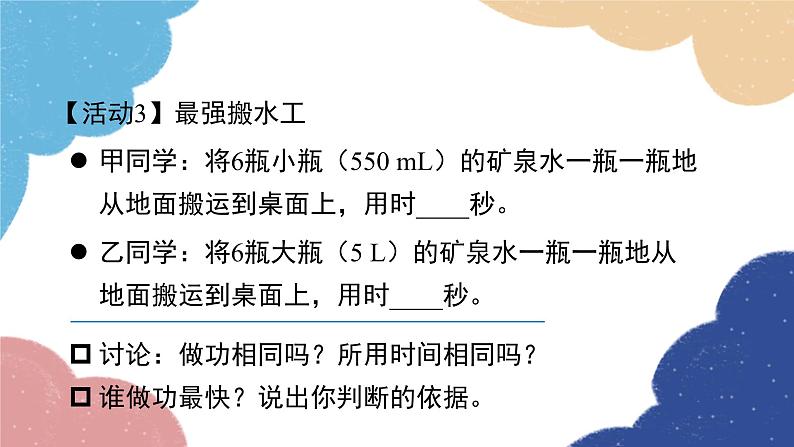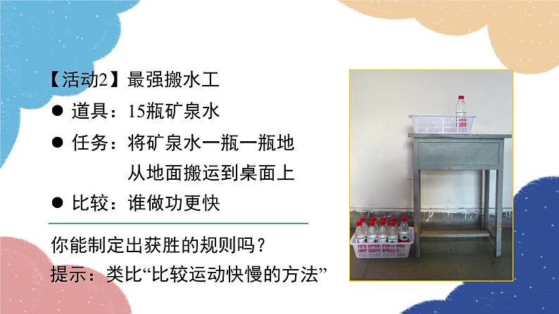 这是一份初中物理粤沪版九年级上册第十一章 机械功与机械能11.2 怎样比较做功的快慢课文内容课件ppt,共19页。PPT课件主要包含了活动3最强搬水工,单位时间内所做的功,活动5测量功率,活动6测量功率,视频,减速增大牵引力,本节课你有哪些收获等内容,欢迎下载使用。