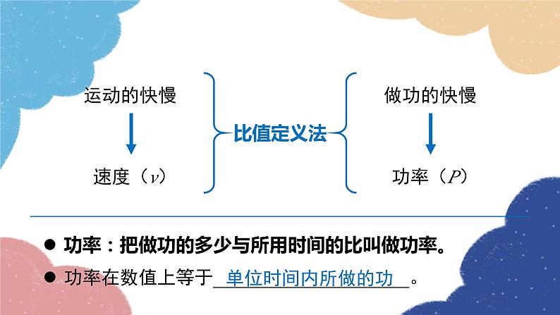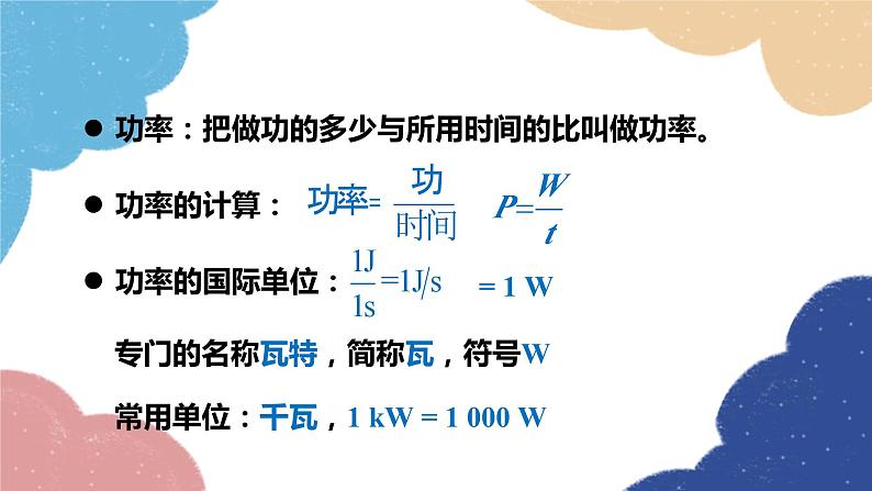 相同的时间,做功越多,做功越快。功率的定义:把做功的多少与所用时间的比叫做功率。功率的公式及常用变形:功率的国际单位:瓦特(W),1 W = 1 J/s