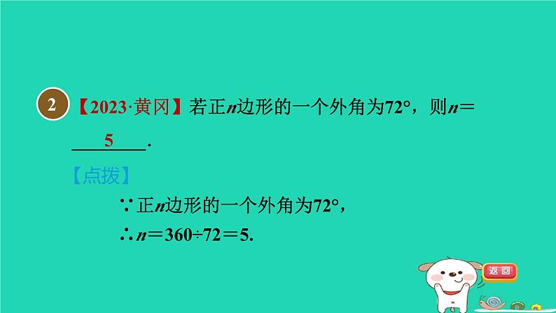 【2023·黄冈】若正n边形的一个外角为72°,则n=________.