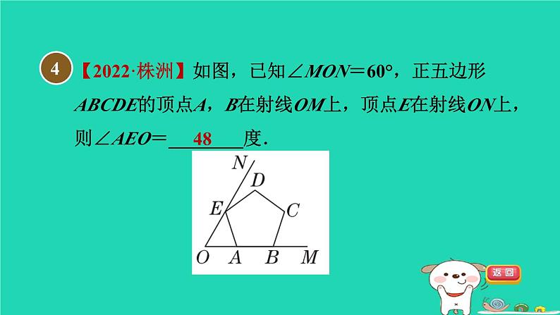 【2022·株洲】如图,已知∠MON=60°,正五边形ABCDE的顶点A,B在射线OM上,顶点E在射线ON上,则∠AEO=________度.