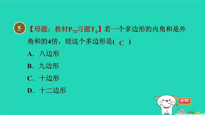【母题:教材P74习题T4】若一个多边形的内角和是外角和的4倍,则这个多边形是( )A.八边形 B.九边形C.十边形 D.十二边形