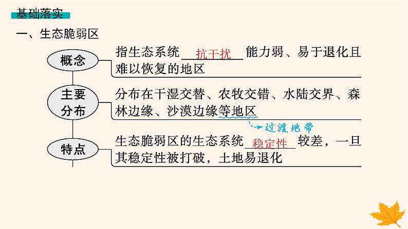 这是一份新高考适用2024版高考地理一轮总复习第3部分区域发展第2章资源环境与区域发展第1讲区域发展的自然环境基础和生态脆弱区的综合治理考点2生态脆弱区的综合治理课件,共60页。PPT课件主要包含了研清教材·固基础,研析考题·明方向,深化整合·提素能,对点训练·促提升,课堂巩固·即时练,抗干扰能力,干湿交替,森林边缘,稳定性,石漠化等内容,欢迎下载使用。