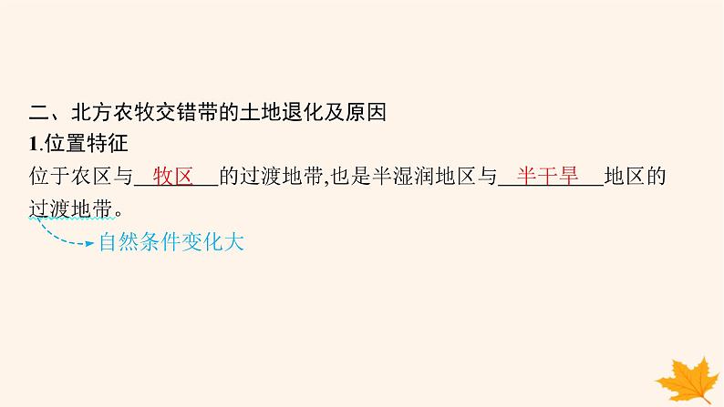 二、北方农牧交错带的土地退化及原因1.位置特征位于农区与 的过渡地带,也是半湿润地区与 地区的过渡地带。 自然条件变化大