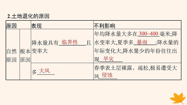 1.北方农牧交错带荒漠化的成因(1)自然因素:自然因素为荒漠化的发展提供了条件。