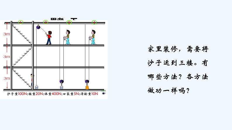 家里装修,需要将沙子运到三楼。有哪些方法?各方法做功一样吗?
