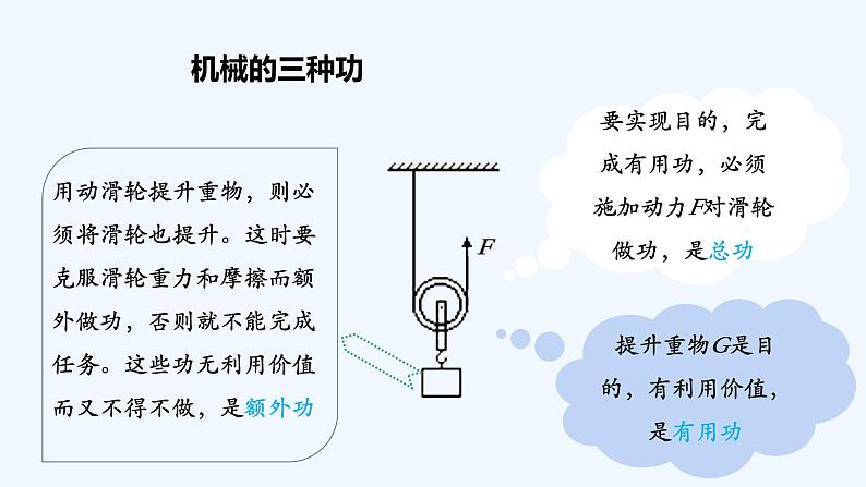用动滑轮提升重物,则必须将滑轮也提升。这时要克服滑轮重力和摩擦而额外做功,否则就不能完成任务。这些功无利用价值而又不得不做,是额外功