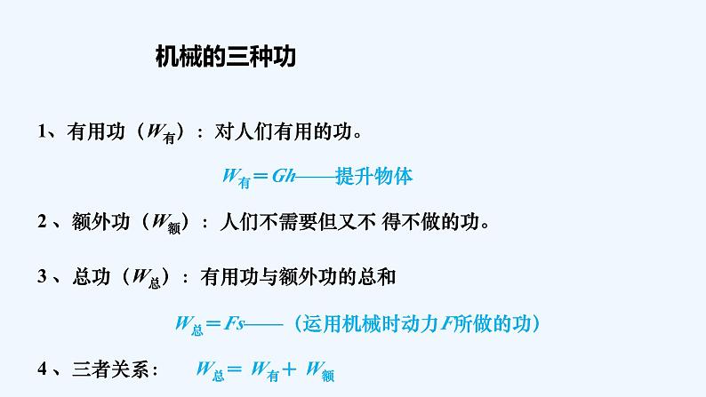 3 、总功(W总):有用功与额外功的总和W总=Fs——(运用机械时动力F所做的功)