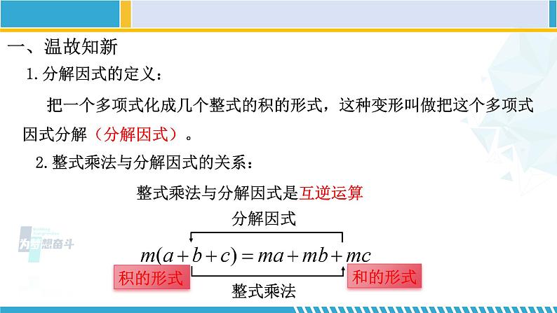 把一个多项式化成几个整式的积的形式,这种变形叫做把这个多项式因式分解(分解因式)。