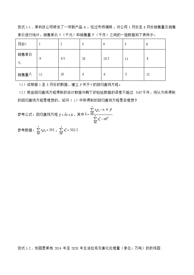 变式1-1.某科技公司研发了一项新产品,经过市场调研,对公司1月份至6月份销售量及销售单价进行统计,销售单价(千元)和销售量(千件)之间的一组数据如下表所示: