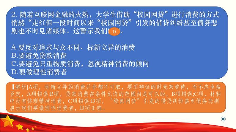 《安徽省高职单招职业适应性测试》1-4(多选)中国古代立志勤学的名人很多,如人们熟知的_故事都生动描述了他们克服困难、坚持自学的感人事迹。( ) A.头悬梁 B.锥刺股 C.囊萤映雪 D.凿壁借光ABCD2.法人是具有民事权利能力和民事行为能力,依法独立享有民事权利和承担民事义务的( ).A.组织 B.企业领导人 C.团体负责人A【解析】 法人是具有民事权利能力和民事行为能力,依法独立享有民事权利和承担民事义务的组织。3.能量守恒定律的建立是人类认识自然的一次重大飞跃,它是最普遍、最重要、最可靠的自然规律之一。下列说法正确的是( ).A.因为能量守恒,所以不需要节约能源B.因为能量不会消失,所以不可能有能源危机C.不同形式的能量之间可以相互转化D.能量可以被消灭,也可以被创生【解析】能量既不会凭空产生,也不会凭空消失,它只能从一种形式转化为其他形式,或者从一个物体转移到别的物体,在转化或转移的过程中其总量不变。C4.把下面的六个图形分为两类,使每一类图形都有各自的共同特征或规律,分类正确的一项是( ). A.①⑤⑥,②③④ B.①④⑤,②③⑥ C.①②⑤,③④⑥ D.①④⑥,②③⑤【解析]考查黑色阴影部分将正方形分割成面的个数,其中①②⑤为2个,③④⑥为3个.C5.豆浆又叫“植物奶”,被国际营养协会评定为健康食品和世界六大营养饮料之一。但是喝豆浆也有注意事项,以下正确的食用方法是( ).A.喝没有煮沸的豆浆B.豆浆中冲入鸡蛋C.喝豆浆时搭配馒头等食物D.用保温瓶长时间储存豆浆【解析】 A项,饮用未被彻底加热的豆浆,容易造成中毒:B项,豆浆冲鸡蛋,鸡蛋中的黏液性蛋白容易和豆浆中的胰蛋白酶结合,产生不被人体吸收的物质而减弱营养价值:D项,保温瓶装豆浆易使细菌繁殖。C6.下列说法中正确的是( )。A.力的三要素中有一个改变,力的作用效果将改变B.力是使物体运动的原因C只有相互接触的物体间力的作用才是相互的D.力不可以改变物体的运动方向【解析】B项,力是改变物体运动状态的原因,惯性是使物体运动的原因:C项,不接触的物体之间也能产生力的作用,例如磁铁和铁钉:D项,力既可以改变物体的形状又可以改变物体的运动状态。A7.生活处处有化学,安全时刻记心中。下列做法不合理的是( )。A.若发现家用煤气泄漏,应立即关闭阀门,并开窗通风B.燃放烟花爆竹时,要远离人群和可燃物C.用甲醛溶液浸泡海产品,以防其变质D.霉变的大米、花生等不能食用【解析】甲醛有毒,能破坏人体蛋白质的结构,使之失去生理功能,不能食用。C8.婉转对于___相当于_对于烈日炎炎。( ) A.委婉阴雨绵绵 B.谢绝骄阳似火 C.率真汗流浃背 D.直接天寒地冻【解析】婉转和直接为反义词,天寒地冻和烈日炎炎为反义词。D9.下列歇后语错误的一项是( )。A.芝麻开花-节节高B.竹篮打水场空C.热锅上的蚂蚁七上八下D.王婆卖瓜---自卖自夸【解析】热锅上的蚂蚁一一团团转C10.教育是一个国家能否在世界竟争中站得住脚的重要基石,中国在近代教育发展史上的探索依次经历了( )。①洋务运动初创办的京师同文馆 ②第一所国家创办的京师大学堂③1905 年废除科举制 ④提出科教兴国战略 A.①②③④ B.①②④ C.①②③ D.①③④【解析】提出科教兴国战略是在20世纪90年代,不属于中国近代教育。C11.郑和七下“西洋”指的是( )。 A.太平洋 B.大西洋 C.印度洋 D.北冰洋【解析】明朝时期的西洋普遍指的是今天的文莱,马来西亚以西的东南亚各国和印度洋沿岸地区。C12.下列选项中,不易引起沟通障碍的行为表现是( ). A.讲话模糊 B.言简意赅 C.信息不对称[解析]沟通障碍主要来自三个方面:发送者的障碍、接受者的障碍和信息传播通道的障碍。B13. (多选)同事间建立信赖关系应该努力做到( ).A.不说同事的坏话B.开诚布公地与同事相处C.彼此看重对方D.不随便批评同事的言行ABCD14.一个完整的微型计算机系统应包括( )。A.计算机及外部设备B.主机箱、键盘、显示器和打印机C.硬件系统和软件系统D.系统软件和系统硬件【解析】计算机是由硬件和软件组成的,硬件系统通常由五部分组成:输入设备、输出设备、存储器、运算器和控制器;软件系统包括存储器、运算器和控制器。C15.技术具有专利性,专利权是知识产权的一部分,专利技术在一定有效期内受到保护。但是专利权不能自动取得,申请人必须履行《中华人民共和国专利法》的相关程序,由国家专利局授予专利权。a.提交申请阶段;b.受理阶段;c.初审阶段;d.发明专利申请公布阶段;e.发明专利申请实质审查阶段;f.授权阶段。申请技术发明专利的正确流程是 ( )。 A.abcdef B.abdcef C.abcedf D.abcefdA16. “硅谷”是高技术密集工业的工业区的代名词,请问它在( )。 A.洛杉矶 B.华盛顿 C.纽约 D.加利福尼亚[解析]硅谷是美国加利福尼亚州旧金山附近高技术密集的工业区。D17.原子核中一定含有的粒子是( )。 A.中子 B.质子 C.电子 D.质子和中子【解析】原子核由质子和中子构成D18.造成非吸烟者在公共场所吸食“二手烟”的主要原因是( )。A.分子很小 B.分子在不断运动C.分子之间有间隙 D.分子由原子构成B19.我国是一个陆海兼备的大国,我国的陆地总面积大约是__万平方千米。( )。 A.960 B.300 C.1100 D.1260A20.以下关于诚实守信的认识和判断中,正确的是( ).A.诚实守信与经济发展相矛盾B.诚实守信是市场经济应有的法则C.是否诚实守信要视具体对象而定D.