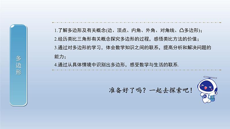 1.了解多边形及有关概念(边、顶点、内角、外角、对角线、凸多边形);2.经历类比三角形有关概念探究多边形的过程,感悟类比方法的价值;3.通过对多边形的学习,体会数学知识之间的联系,提高分析和解决问题的能力;4.通过从具体情境中识别出多边形,感受数学与生活的联系.
