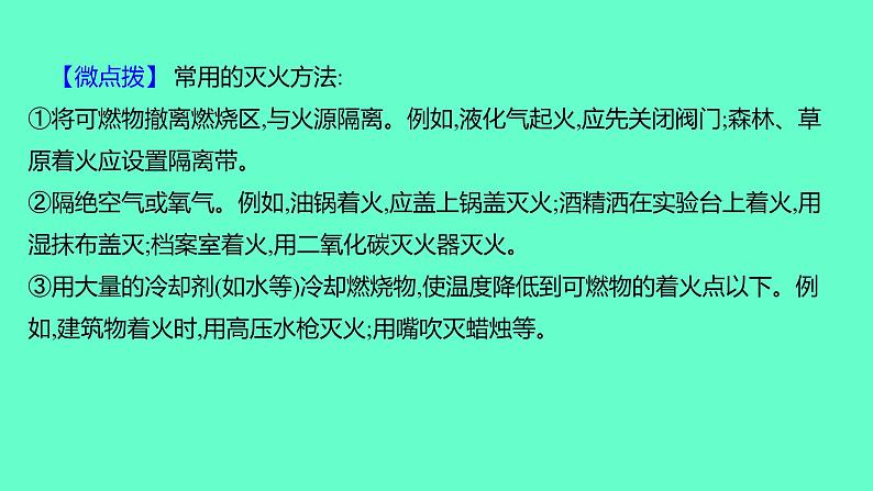 【微点拨】 常用的灭火方法:①将可燃物撤离燃烧区,与火源隔离。例如,液化气起火,应先关闭阀门;森林、草原着火应设置隔离带。②隔绝空气或氧气。例如,油锅着火,应盖上锅盖灭火;酒精洒在实验台上着火,用湿抹布盖灭;档案室着火,用二氧化碳灭火器灭火。③用大量的冷却剂(如水等)冷却燃烧物,使温度降低到可燃物的着火点以下。例如,建筑物着火时,用高压水枪灭火;用嘴吹灭蜡烛等。