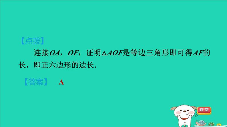 测素质 与圆有关的计算集训课堂 冀教版 九年级下第二十九章 直线与圆的位置关系【2023·宜昌】如图,OA,OB,OC都是⊙O的半径,AC,OB交于点D.若AD=CD=8,OD=6,则BD的长为( )A.5 B.4 C.3 D.21一、选择题(每题4分,共32分)B2如图,正六边形ABCDEF内接于⊙O,⊙O的半径为3,则正六边形ABCDEF的边长为( )【点拨】【答案】A连接OA,OF,证明△AOF是等边三角形即可得AF的长,即正六边形的边长.3如图,正八边形 ABCDEFGH中,∠EAG的大小为( )A.30° B.40° C.45° D.50°C4如图,正方形ABCD内接于⊙O,点P在AB上,则∠BPC的度数为( )A.30° B.45° C.60° D.90°︵【点拨】【答案】B连接AC,易得∠BAC=45°,∴∠BPC=45°.5一条弧所对的圆心角为135°,弧长等于半径为3 cm的圆的周长的5倍,则这条弧的半径为( )A.45 cm B.40 cm C.35 cm D.30 cmB6【2023·张家界】“莱洛三角形”也称为圆弧三角形,它是工业生产中广泛使用的一种图形,如图,分别以等边三角形ABC的三个顶点为圆心,以边长为半径画弧,三段圆弧围成的封闭图形是“莱洛三角形”.若等边三角形ABC的边长为3,则该“莱洛三角形”的周长等于( )【点拨】【答案】B︵︵︵7【2022·天门】如图,在3×3的正方形网格中,小正方形的顶点称为格点,顶点均在格点上的图形称为格点图形,图中的圆弧为格点△ABC外接圆的一部分,小正方形边长为1,图中阴影部分的面积为( )【点拨】如图.作AB的垂直平分线MN,作BC的垂直平分线PQ,设MN与PQ相交于点O,连接OA,OB,OC,则点O是△ABC外接圆的圆心,由题意得OA2=12+22=5,OC2=12+22=5,AC2=12+32=10,∴OA2+OC2=AC2,∴△AOC是直角三角形,且∠AOC=90°.【答案】D8【新趋势·学科内综合】如图,边长为1的正六边形ABCDEF放置于平面直角坐标系中,边AB在x轴正半轴上,顶点F在y轴正半轴上,将正六边形ABCDEF绕坐标原点O顺时针旋转,每次旋转60°,那么经过第2 025次旋转后,顶点D的坐标为( )【点拨】【答案】A94π【2023•温州】若扇形的圆心角为40°,半径为18,则它的弧长为________.二、填空题(每题4分,共20分)10一个圆的内接正三角形的边长为4,则该圆的内接正方形的边长为________.11【新情境·社会热点】 2023年旅游业迎来强势复苏.某古城为了吸引游客,决定在山水流淌的江中修筑如图①所示的“S”型圆弧堤坝.若堤坝的宽度忽略不计,图②中的两段圆弧半径都为57 m,圆心角都为120°,则这“S”型圆弧堤坝的长为________m.(结果保留π)76π【点拨】12【2022·黔东南州】如图,在△ABC中,∠A=80°,半径为3 cm的⊙O是△ABC的内切圆,连接OB,OC,则图中阴影部分的面积是________cm2(结果用含π的式子表示).【点拨】根据∠A的度数和内切圆的性质,得出∠DOE的度数即可求出阴影部分的面积.13【新考向·传承数学文化】中国魏晋时期的数学家刘徽首创“割圆术”,奠定了中国圆周率计算在世界上的领先地位.刘徽提出:“割之弥细,所失弥少,割之又割,以至于不可割,则与圆合体,而无所失矣.”由此求得圆周率π的近似值.3.11【点拨】圆的内接正十二边形被半径分成12个如图所示的等腰三角形,其顶角为30°,即∠AOB=30°.过点O作OH⊥AB于点H,则∠AOH=15°.14三、解答题(共48分)(12分)有一段圆弧形公路,这段圆弧所在圆的半径为45 m,弧所对的圆心角是60°.这段圆弧形公路长多少米(π取3.14)?(12分) 【新考法·等角代换法】如图,点G,H分别是正六边形ABCDEF的边BC,CD上的点,且BG=CH,AG交BH于点P.(1)求证:△ABG≌△BCH;15解:由(1)知△ABG≌△BCH,∴∠BAG=∠HBC.∴∠APH=∠ABP+∠BAG=∠ABP+∠HBC=∠ABC=120°.(2)求∠APH的度数.16(12分)牂牁江“佘月郎山,西陵晚渡”的风景描绘中有半个月亮挂在山上,月亮之上有个“齐天大圣”守护洞口的传说,真实情况是老王山上有个月亮洞,洞顶上经常有猴子爬来爬去,如图是月亮洞的截面示意图. (1)科考队测量出月亮洞的洞宽CD约是28 m,洞高AB约是12 m,通过计算截面所在圆的半径可以解释月亮洞像半个月亮,求半径OC的长(结果精确到0.1 m);(2)若∠COD=162°,点M在CD上,求∠CMD的度数,并用数学知识解释为什么“齐天大圣”点M在洞顶CD上巡视时总能看清洞口CD的情况.⌒⌒解:如图,补全⊙O,在优弧CD上任取一点N,连接CM,DM,CN,DN.∵∠COD=162°,⌒17(12分)【2022·益阳】 【母题·教材P22复习题A组T10】如图,C是圆O被直径AB分成的半圆上一点,过点C的圆O的切线交AB的延长线于点P,连接CA,CO,CB.证明:∵AB是半圆O的直径,∴∠ACB=90°.∵CP是半圆O的切线,∴∠OCP=90°,∴∠ACB=∠OCP.∴∠ACB-∠OCB=∠OCP-∠OCB,即∠ACO=∠BCP.(1)求证:∠ACO=∠BCP;解:由(1)知∠ACO=∠BCP.∵∠ABC=2∠BCP,∴∠ABC=2∠ACO.∵OA=OC,∴∠ACO=∠A,∴∠ABC=2∠A.∵∠ABC+∠A=90°,∴∠A=30°,∠ABC=60°,∴∠ACO=∠BCP=30°,∴∠P=∠ABC-∠BCP=60°-30°=30°.(2)若∠ABC=2∠BCP,求∠P的度数;(3)在(2)的条件下,若AB=4,求图中阴影部分的面积(结果保留π和根号).