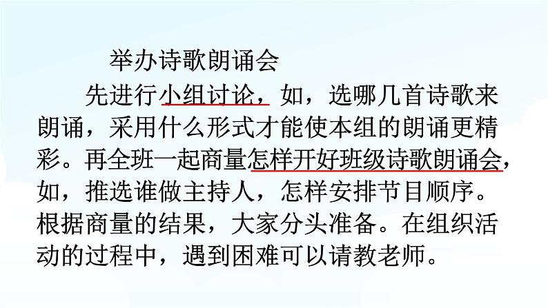 语文四年级下册综合性学习:轻叩诗歌大门授课课件ppt: 这是一份语文四年级下册综合性学习:轻叩诗歌大门授课课件ppt,共16页。PPT课件主要包含了搜集诗歌,轻叩诗歌大门,欣赏诗歌,小组讨论交流,诗歌朗诵会,合编小诗集,写哪些内容,编排要求,优秀评选等内容,欢迎下载使用。
