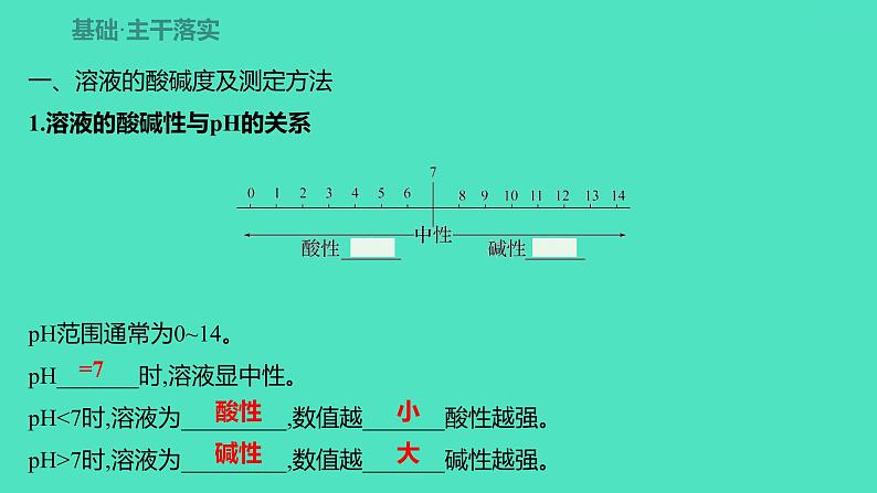 一、溶液的酸碱度及测定方法1.溶液的酸碱性与pH的关系pH范围通常为0~14。pH_______时,溶液显中性。 pH<7时,溶液为_________,数值越_______酸性越强。 pH>7时,溶液为_________,数值越_______碱性越强。