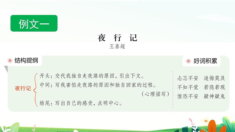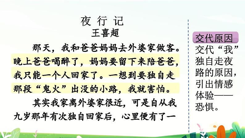 交代原因交代“我”独自走夜路的原因,引出情感体验——恐惧。