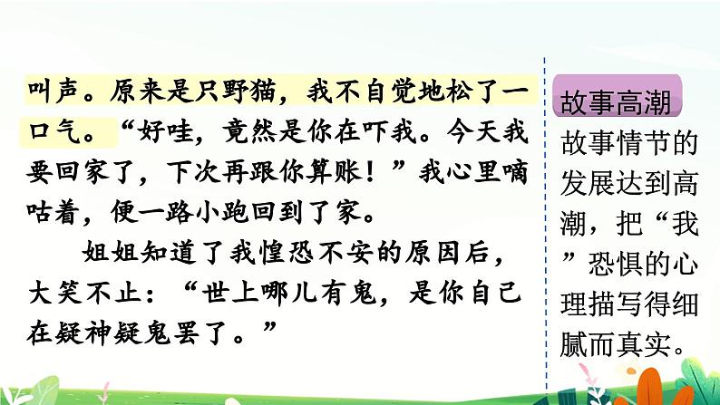故事高潮 故事情节的发展达到高潮,把“我”恐惧的心理描写得细腻而真实。