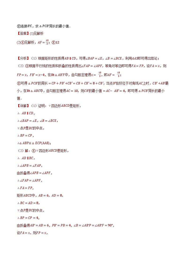 ②可得△PCB′的周长=CP+PB′+CB′=CB+CB′=8+CB′,当点B′恰好位于对角线AC上时,CB′+AB′最小,在Rt△ABC中,由勾股定理得AC=10,则CB′的最小值=AC− AB′=4,即可得△PCB′周长的最小值.