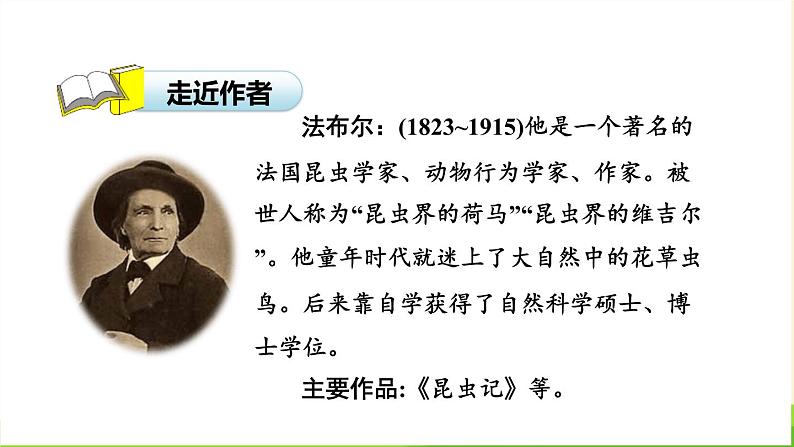 法布尔:(1823~1915)他是一个著名的法国昆虫学家、动物行为学家、作家。被世人称为“昆虫界的荷马”“昆虫界的维吉尔”。他童年时代就迷上了大自然中的花草虫鸟。后来靠自学获得了自然科学硕士、博士学位。主要作品:《昆虫记》等。