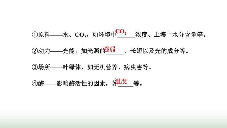 ①原料——水、CO2,如环境中______浓度、土壤中水分含量等。②动力——光能,如光照的______、长短以及光的成分等。③场所——叶绿体,如无机营养、病虫害等。④酶——影响酶活性的因素,如_____等。