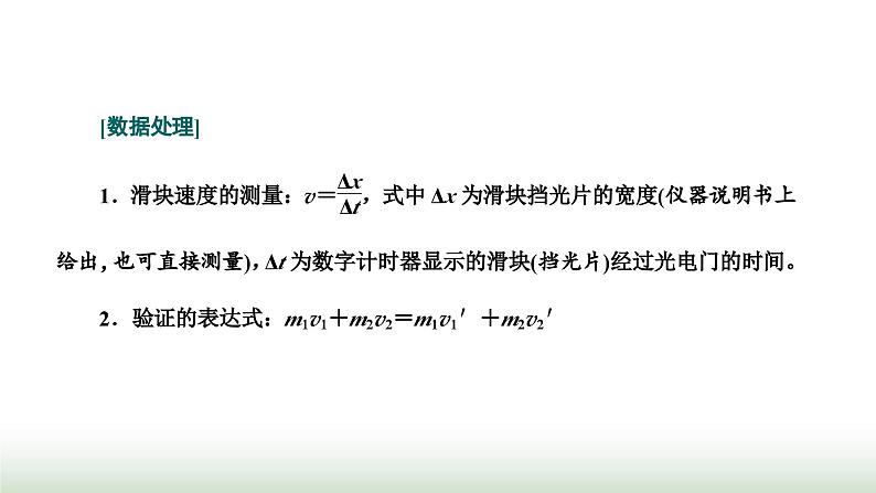 [数据处理]验证的表达式:m1·OP=m1·OM+m2·ON误差分析1.系统误差:主要来源于装置本身是否符合要求。(1)碰撞是否为一维。(2)实验是否满足动量守恒的条件,如气垫导轨是否水平,两球是否等大,用长木板实验时是否平衡掉摩擦力。2.偶然误差:主要来源于质量m和速度v的测量。