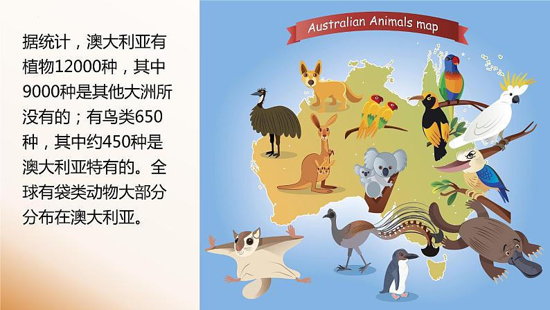 这是一份人教版 (新课标)七年级下册第八章 东半球其他的国家和地区第四节 澳大利亚示范课ppt课件,共16页。PPT课件主要包含了我做小小解说员,世界活化石博物馆,鸭嘴兽,金合欢,因地制宜,骑在羊背上的国家,合作探究,小组展示等内容,欢迎下载使用。