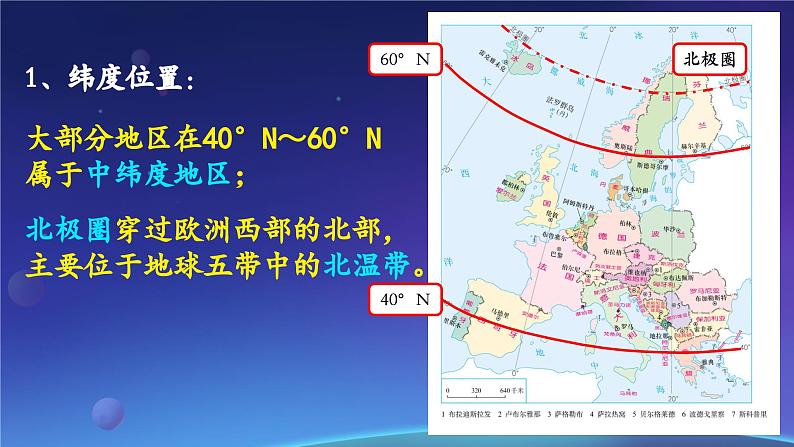 大部分地区在40°N~60°N属于中纬度地区;北极圈穿过欧洲西部的北部,主要位于地球五带中的北温带。