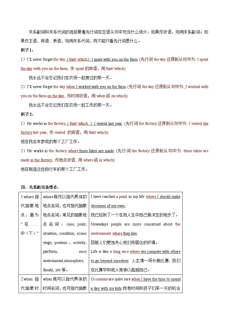 如果先行词是指代“时间的名词”,还原到定语从句中作时间状语,则用关系副词when;如果先行词是指代“地点的名词”,还原到定语从句中作地点状语,则用关系副词where;如果先行词是指代“原因的名词(reasn)”,还原到定语从句中作原因状语,则用关系副词why。