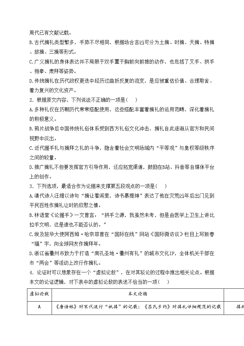 解析:B.偏离驳论重点,虚拟论敌应为“传统揖礼是‘封建’的写照”。