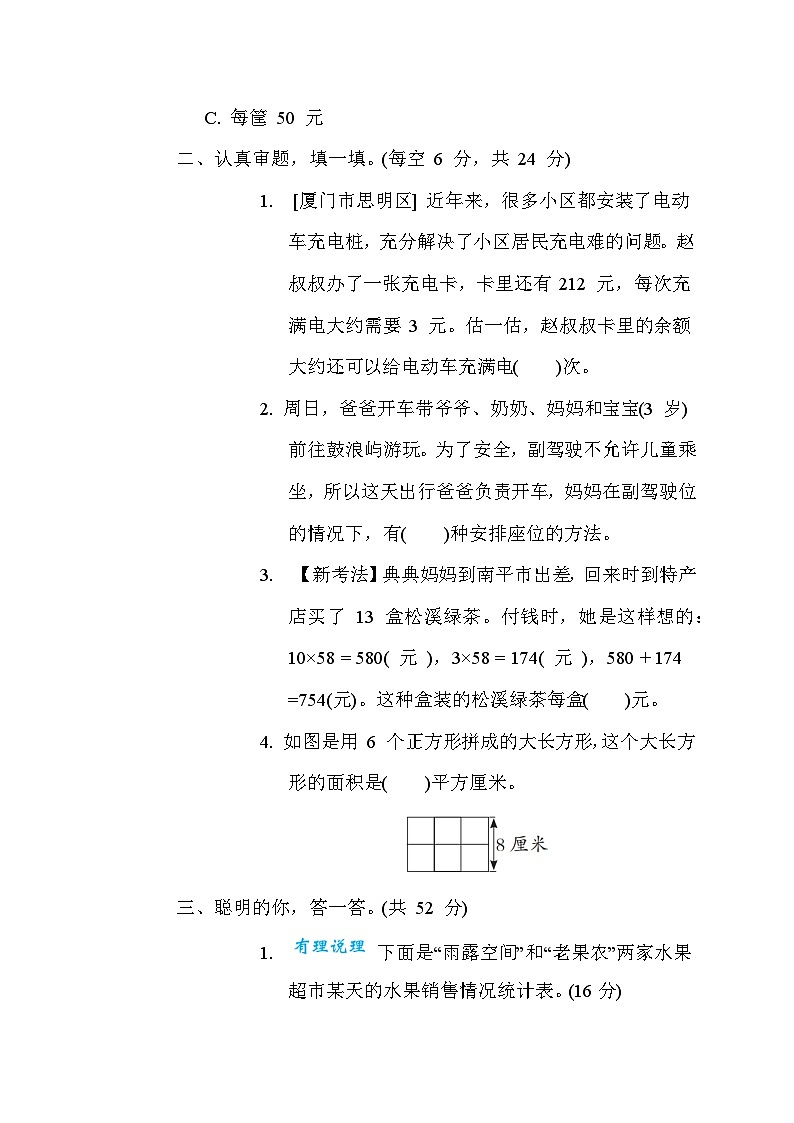 人教版数学三年级下册期末复习冲优分类评价4. 新题型(含答案)