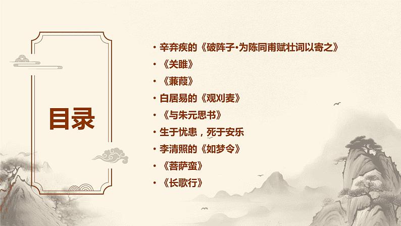 辛弃疾的《破阵子·为陈同甫赋壮词以寄之》《关雎》《蒹葭》白居易的《观刈麦》《与朱元思书》生于忧患,死于安乐李清照的《如梦令》《菩萨蛮》《长歌行》