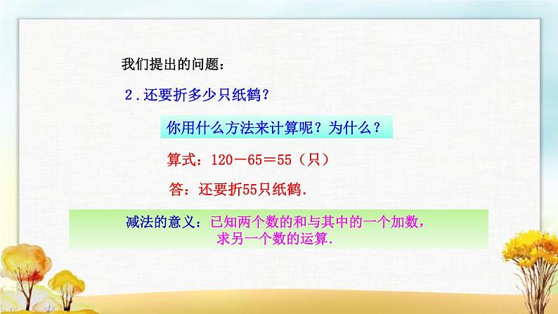 减法的意义:已知两个数的和与其中的一个加数,求另一个数的运算.