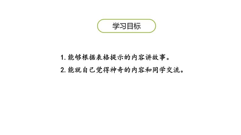1.能够根据表格提示的内容讲故事。 2.能就自己觉得神奇的内容和同学交流。