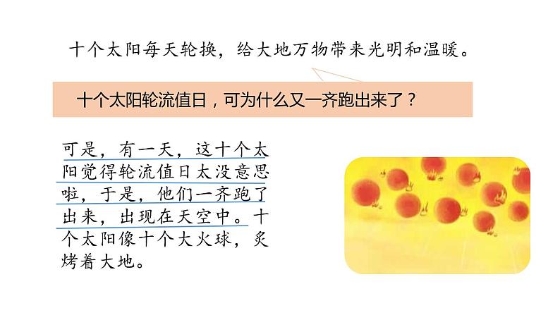 这是一份人教部编版二年级下册羿射九日教学演示课件ppt,共38页。PPT课件主要包含了羿射九日,事情发展的先后顺序,第一层,十个太阳炙烤,大地人类生活艰难,第二层,后羿射下九个,第三层,事情的结果7,大地重新回到等内容,欢迎下载使用。