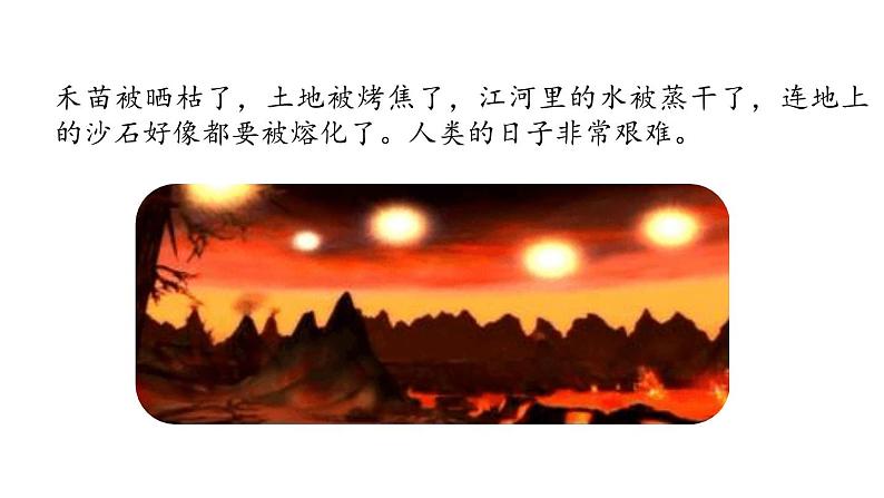 禾苗被晒枯了,土地被烤焦了,江河里的水被蒸干了,连地上的沙石好像都要被熔化了。人类的日子非常艰难。