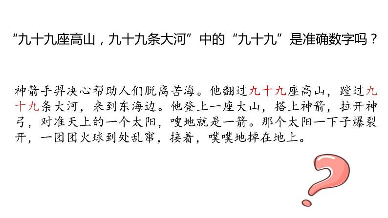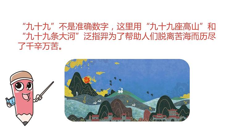 “九十九”不是准确数字,这里用“九十九座高山”和“九十九条大河”泛指羿为了帮助人们脱离苦海而历尽了千辛万苦。