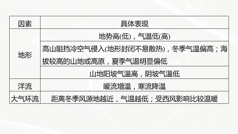(1)相距较远的南北两地,年均温差异的主要因素一般考虑纬度因素。(2)相距较远的东西两地,年(日)温差大小的主要因素一般考虑海陆位置(距海远近)因素。(3)如果某地冬季气温明显偏高,则可能有地形对冬季风起阻挡作用,常考虑地形因素;如果夏季气温明显偏低,则可能位于海拔较高的山地或高原。