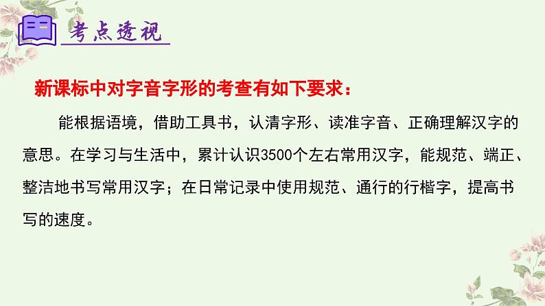 展开新课标中对字音字形的考查有如下要求: 能根据语境,借助工具书,认清字形、读准字音、正确理解汉字的意思。在学习与生活中,累计认识3500个左右常用汉字,能规范、端正、整洁地书写常用汉字;在日常记录中使用规范、通行的行楷字,提高书写的速度。