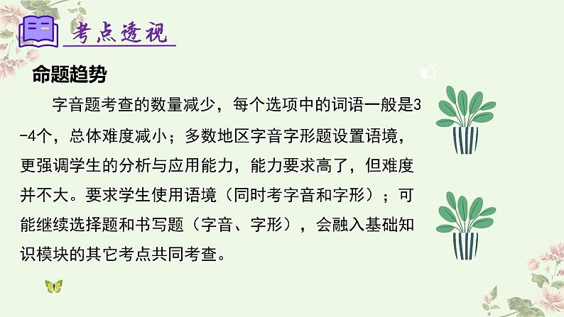命题趋势 字音题考查的数量减少,每个选项中的词语一般是3-4个,总体难度减小;多数地区字音字形题设置语境,更强调学生的分析与应用能力,能力要求高了,但难度并不大。要求学生使用语境(同时考字音和字形);可能继续选择题和书写题(字音、字形),会融入基础知识模块的其它考点共同考查。