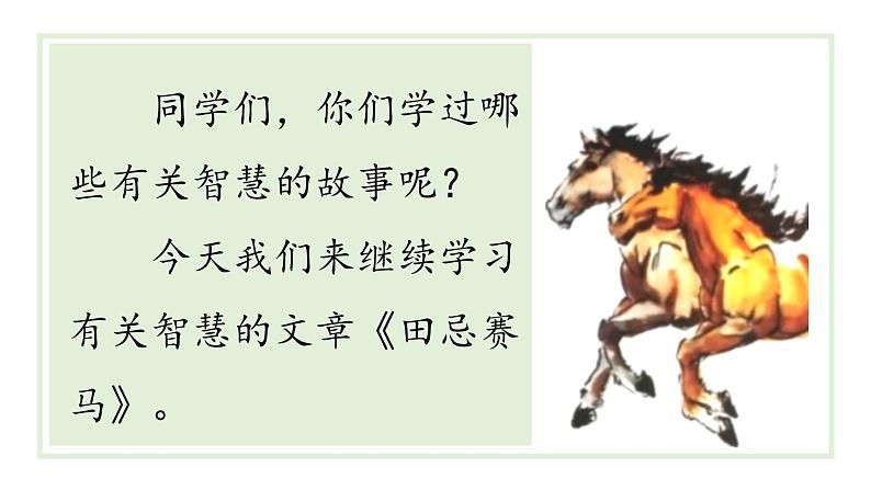 同学们,你们学过哪些有关智慧的故事呢? 今天我们来继续学习有关智慧的文章《田忌赛马》。