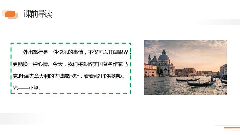 外出旅行是一件快乐的事情,不仅可以开阔眼界,更能换一种心情。今天,我们将跟随美国著名作家马克.吐温去意大利的古城威尼斯,看看那里的独特风光——小艇。