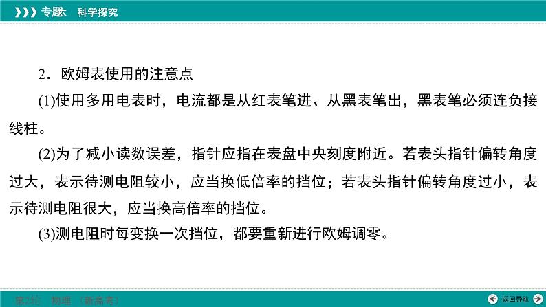展开2.欧姆表使用的注意点(1)使用多用电表时,电流都是从红表笔进、从黑表笔出,黑表笔必须连负接线柱。(2)为了减小读数误差,指针应指在表盘中央刻度附近。若表头指针偏转角度过大,表示待测电阻较小,应当换低倍率的挡位;若表头指针偏转角度过小,表示待测电阻很大,应当换高倍率的挡位。(3)测电阻时每变换一次挡位,都要重新进行欧姆调零。