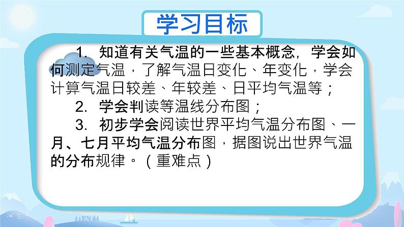 1.知道有关气温的一些基本概念,学会如何测定气温,了解气温日变化、年变化,学会计算气温日较差、年较差、日平均气温等; 2.学会判读等温线分布图; 3.初步学会阅读世界平均气温分布图、一月、七月平均气温分布图,据图说出世界气温的分布规律。(重难点)